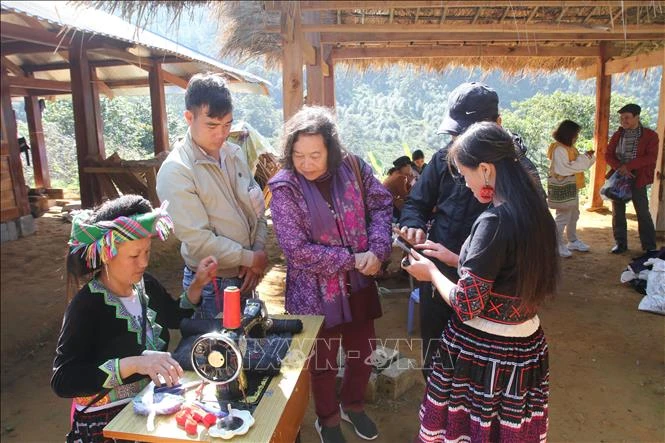 Khách du lịch thích thú trước những nét văn hoá đặc sắc của người Mông vẫn còn gìn giữ ở bản Sin Suối Hồ, Lai Châu. Ảnh: Hoàng Nam-TTXVN