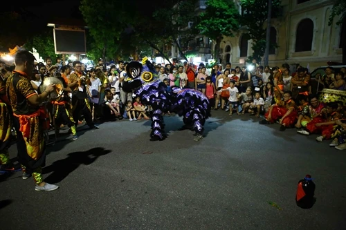 Một tiết mục biểu diễn tại phố đi bộ quanh bờ hồ Hoàn Kiếm thu hút đông đảo người xem.