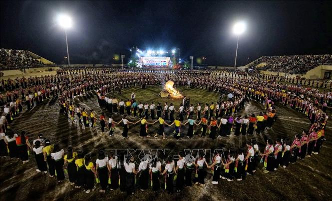 Màn trình diễn nghệ thuật Xòe Thái với sự tham gia của 2020 nghệ nhân và diễn viên quần chúng. Ảnh: Thành Đạt - TTXVN