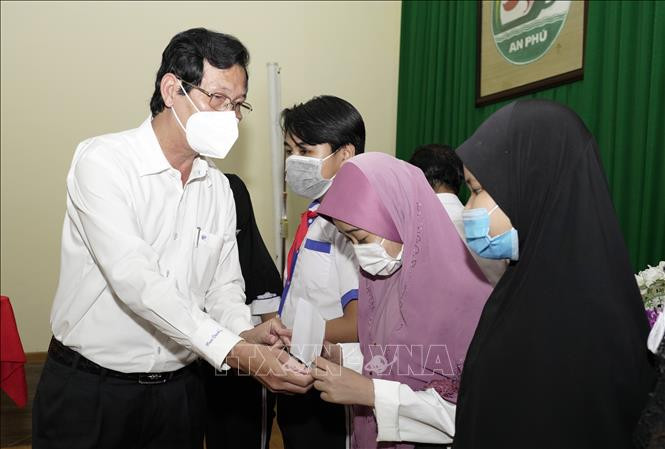 Trao học bổng cho các em học sinh dân tộc Chăm trên địa bàn huyện An Phú. Ảnh: Công Mạo-TTXVN
