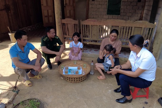 Cán bộ Đồn Biên phòng Chiềng Tương đến nhà thăm hỏi, động viên chia sẻ cùng bà con. Ảnh: Hữu Quyết - TTXVN