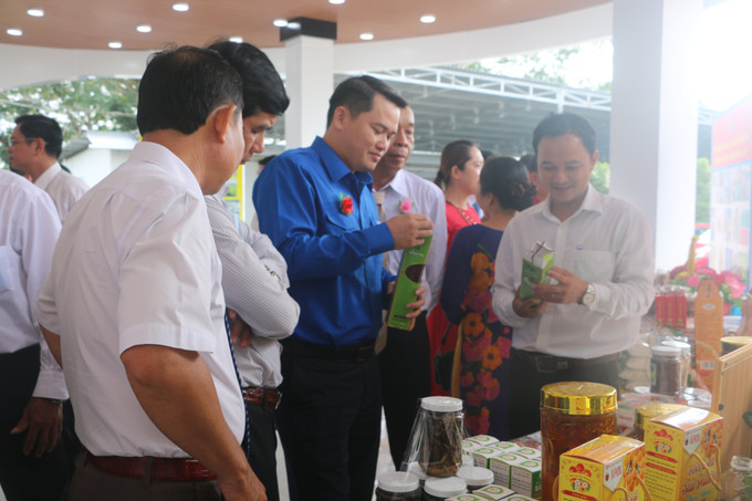 Các đại biểu tham quan sản phẩm của nông dân sản xuất, kinh doanh giỏi. Ảnh: Nhật Bình - TTXVN