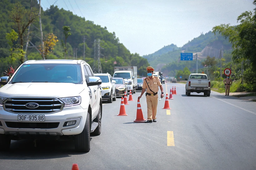 Lực lượng cảnh sát giao thông phân luồng xe để đảm bảo trật tự và không bỏ sót người qua chốt kiểm soát. Ảnh: Trọng Đạt - TTXVN