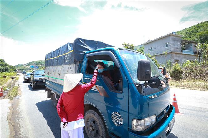 Người qua chốt đều được kiểm tra kỹ càng, từ thân nhiệt đến lịch sử di chuyển để đảm bảo các nguyên tắc phòng, chống dịch COVID-19. Ảnh: Trọng Đạt - TTXVN