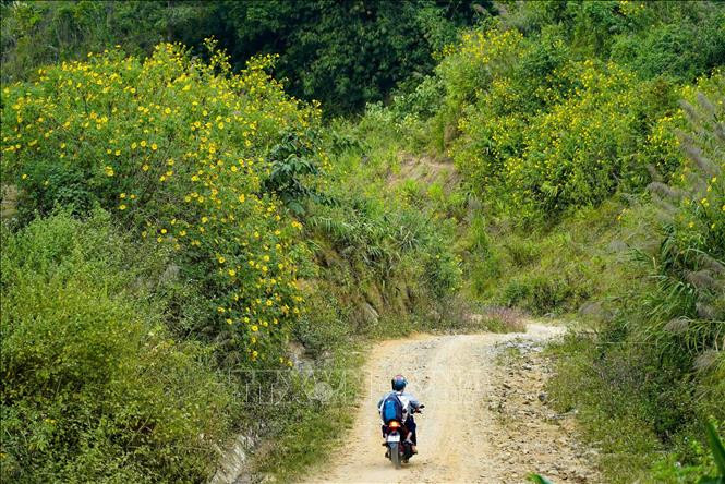 Các cung đường vào các bản được phủ sắc vàng rực rỡ của hoa dã quỳ. Ảnh: Xuân Tư – TTXVN