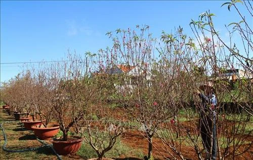 | Vườn đào của anh Trần Văn Văn, tổ 1, phường Thắng Lợi, thành phố Pleiku đang bung nụ, chờ đón xuân. Ảnh: Hồng Điệp - TTXVN |