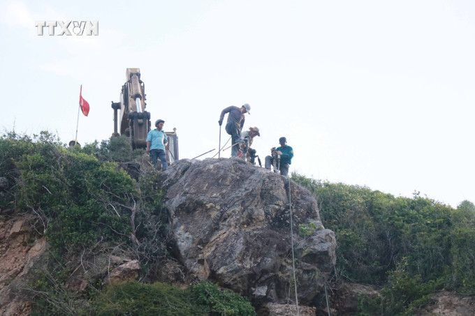 Ông Quách Tân Bình, Phó Giám đốc Công ty Công nghiệp hóa chất Nam Trung Bộ cho biết, từ 8 giờ cùng ngày, đội ngũ kỹ thuật đã khảo sát thực địa và phát hiện phần đá này cắm sâu vào khối đá lớn.