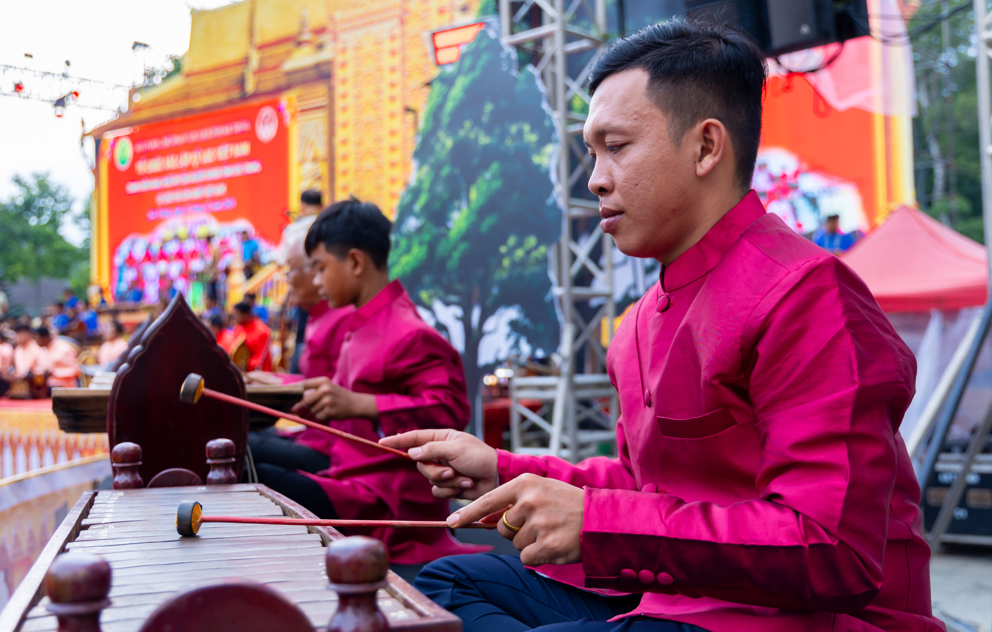 Nhạc Ngũ âm của đồng bào Khmer được hợp thành 5 bộ nhạc cụ được làm từ 5 loại chất liệu khác nhau tạo nên 5 âm sắc riêng biệt: bộ đồng, bộ sắt, bộ mộc, bộ hơi và bộ da. Ảnh: An HiếuCác nhạc công tập luyện trước giờ xác lập kỷ lục Việt Nam. Ảnh: An HiếuCác nhạc công trong trang phục truyền thống cùng nhau diễn tấu dàn nhạc Ngũ âm đề xác lập kỷ lục Việt Nam. Ảnh: An Hiếu