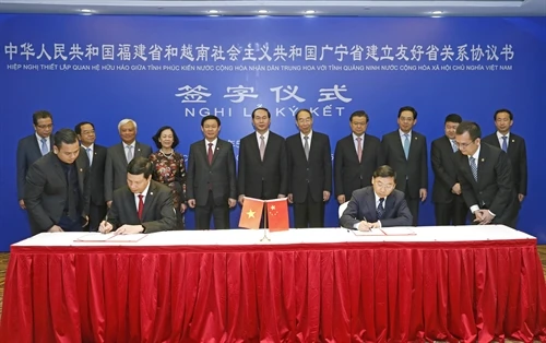 | Chủ tịch nước Trần Đại Quang chứng kiến Lễ ký thoả thuận hợp tác giữa tỉnh Quảng Ninh của Việt Nam với tỉnh Phúc Kiến của Trung Quốc. Ảnh: Nhan Sáng-TTXVN |