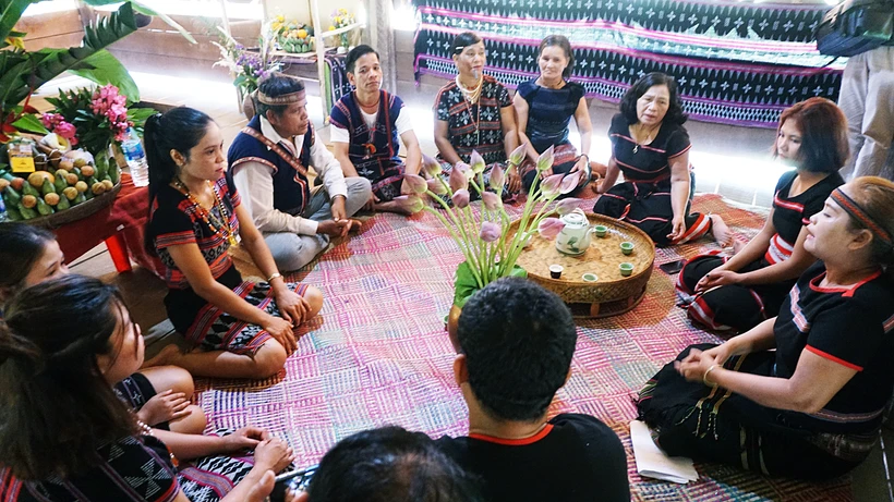 Đồng bào các dân tộc Tây Nguyên kể cho nhau nghe những kỷ niệm và câu chuyện về Bác Hồ kính yêu. Ảnh: Hoàng Tâm