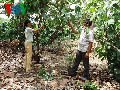 Vợ chồng ông Y Ban Buôn Krông cùng chăm sóc vườn ca cao của gia đình