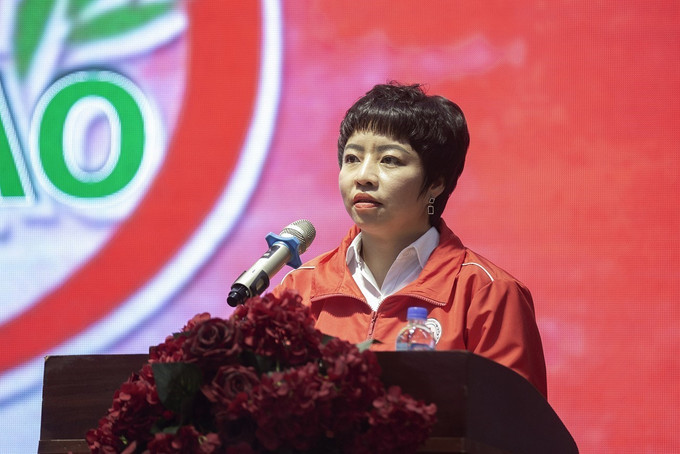 Chủ tịch Hội Chữ thập đỏ thành phố Hòa Bình Trần Thị Hoa phát biểu tại chương trình "Sức mạnh nhân đạo” với chủ đề “Tết nhân ái” Xuân Quý Mão 2023. Ảnh: Trọng Đạt-TTXVN