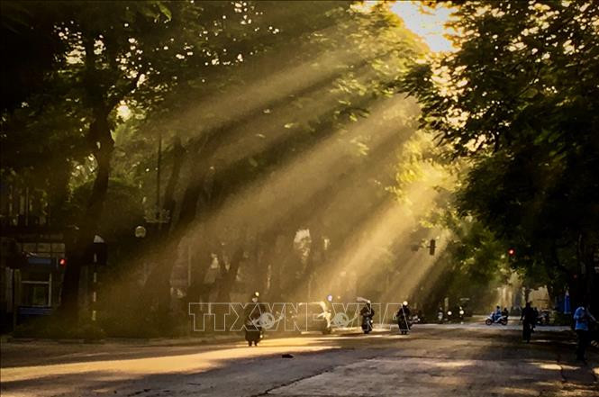 Những tia nắng sớm thu vàng ươm đẹp mê hồn trải dài trên con đường Lý Thường Kiệt. Ảnh: Hải Anh - TTXVN