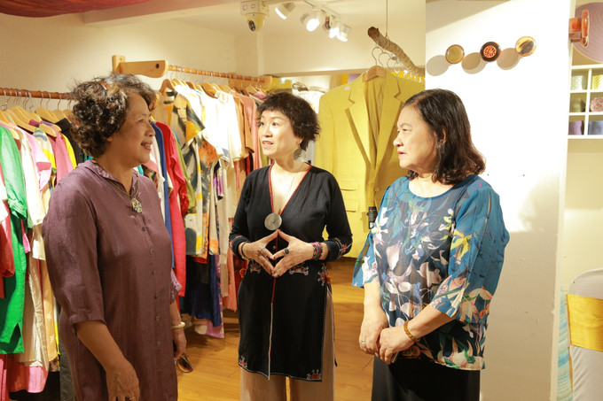 Các nhà nghiên cứu trao đổi, thảo luận về các sản phẩm tơ lụa được kéo sợi từ cuống cây sen.
