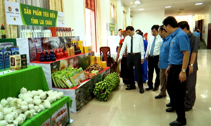 Các đại biểu thăm gian hàng sản phẩm tiêu biểu, sản phẩm OCOP của Hội nông dân tỉnh Lai Châu tại Hội thi Nhà nông đua tài lần thứ V. Ảnh: Việt Hoàng