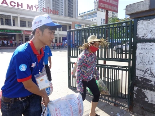 | Sinh viên tình nguyện giúp đỡ thí sinh và người nhà tại bến xe Mỹ Đình. |