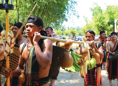| Nhà trai mang sính lễ đến nhà gái trong Lễ cưới của người M’nông (Đắk Nông). |