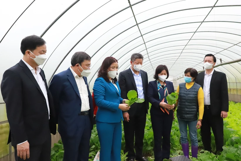 Phó Bí thư Thường trực Thành ủy Hà Nội Nguyễn Thị Tuyến (thứ 3, từ phải sang trái) thăm, kiểm tra hoạt động sản xuất của Hợp tác xã rau hữu cơ Cuối Quý tại xã Đan Phượng, huyện Đan Phượng (Hà Nội).