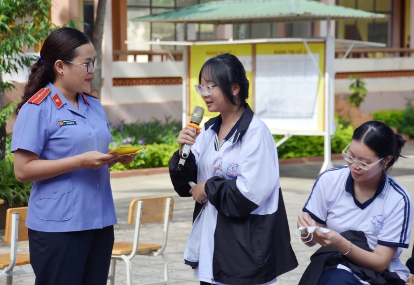 Ngày 4/11/2023, tại trường THPT Lê Quý Đôn (thành phố Buôn Ma Thuột), Tỉnh đoàn Đắk Lắk phối hợp với Viện Kiểm sát nhân dân tỉnh tổ chức “Phiên tòa giả định” tuyên truyền pháp luật năm 2023, với sự tham gia của hơn 1.600 học sinh, đoàn viên, thanh niên. Trong ảnh: Học sinh giao lưu, trả lời kiến thức pháp luật rút ra từ phiên tòa giả định và nhận thức về bạo lực học đường. Ảnh: Hoài Thu – TTXVN