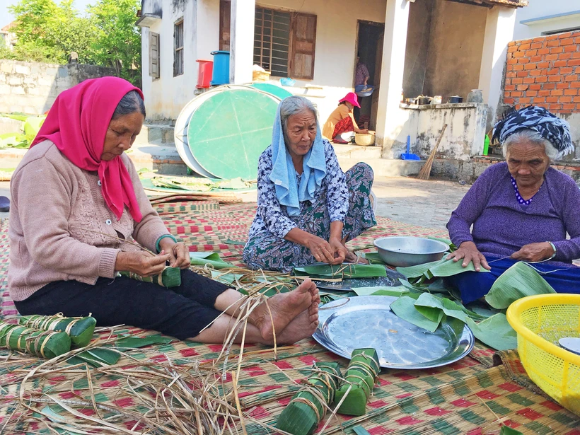 Vào dịp lễ hội, Tết Rija Nagar, phụ nữ Chăm lại cùng nhau chuẩn bị nguyên liệu để gói bánh tapei anung rồi lựa ra những chiếc bánh ngon nhất, đẹp nhất dâng lên thần linh và tổ tiên. Ảnh: Isvan Campa