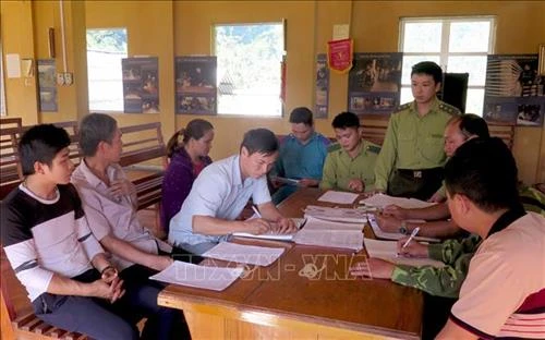 | Lực lượng kiểm lâm Hạt kiểm lâm huyện Lâm Bình tuyên truyền về Luật bảo vệ rừng thông qua các buổi sinh hoạt động cộng đồng. Ảnh: Văn Tý - TTXVN |