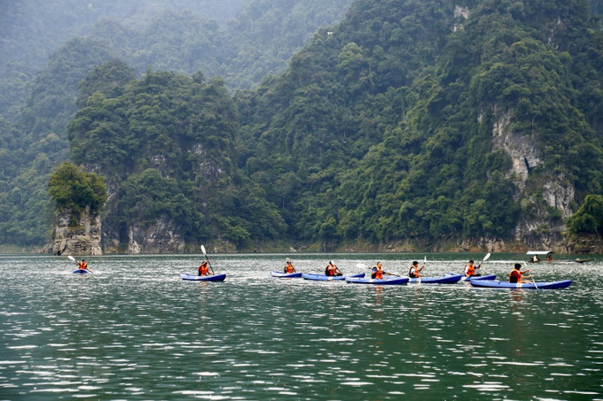 Du khách chèo thuyền kayak khám phá lòng hồ thủy điện Lâm Bình. Ảnh: Nam Sương - TTXVN