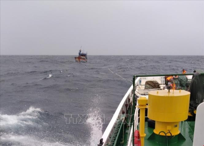 Tàu kiểm ngư 467 đang lai dắt tàu cá BĐ 98658 TS và 11 thuyền viên trên tàu về đất liền. Ảnh minh họa: TTXVN phát