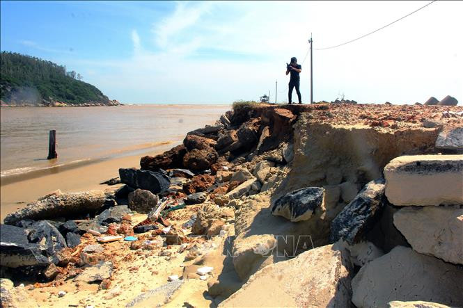 Bờ biển Tam Quan Bắc, thị xã Hoài Nhơn bị sạt lở nghiêm trọng. Ảnh: Nguyên Linh - TTXVN