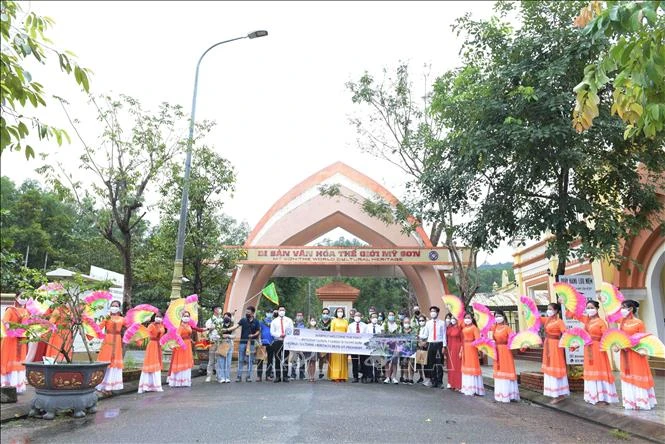 Đoàn du khách quốc tế tham quan Di sản văn hóa thế giới Mỹ Sơn. Ảnh: Đoàn Hữu Trung - TTXVN