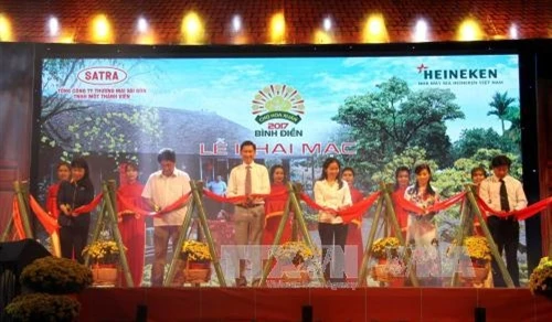 | Phó Chủ tịch UBND Thành phố Hồ Chí Minh Trần Vĩnh Tuyến cùng lãnh đạo các sở ngành thành phố cắt băng khai mạc chợ hoa Bình Điền. Ảnh: Thanh Vũ-TTXVN |