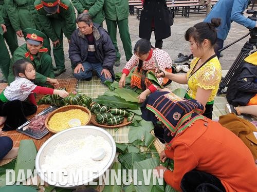 | Đồng bào các dân tộc và các chiến sĩ chung sức gói bánh chưng tặng người nghèo. Ảnh: Hoàng Hải |