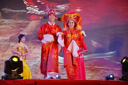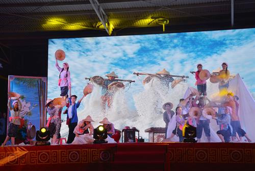 | Tiết mục thi diễn trong đêm khai mạc của đơn vị Thị xã Vĩnh Châu. Ảnh: Hoài Thu/TTXVN |
