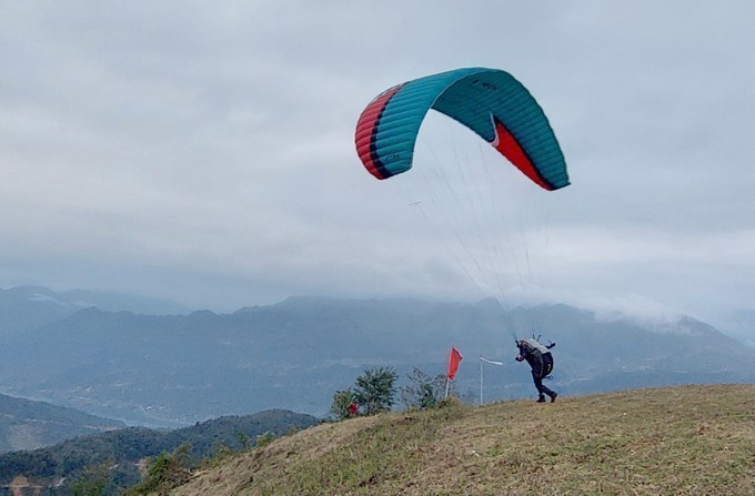 Các đội thi tham gia Giải vô địch Câu lạc bộ dù lượn quốc gia lần 3 năm 2023 tổ chức tại thị xã Mường Lay trình diễn bay. Ảnh: TTXVN phát
