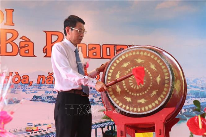 Ông Đinh Văn Thiệu, Phó Chủ tịch UBND tỉnh Khánh Hòa, đánh trống khai mạc lễ hội Tháp Bà Ponagar năm 2022. Ảnh: Tiên Minh – TTXVN