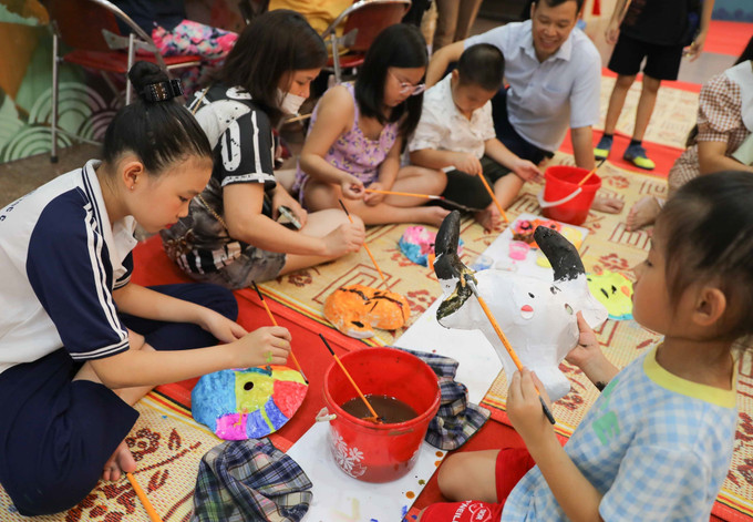 Thiếu nhi cùng tham gia vẽ mặt nạ giấy. Ảnh: Thanh Tùng – TTXVN