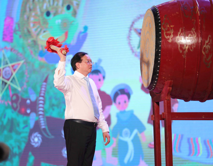 Thứ trưởng Bộ Văn hóa, Thể thao và Du lịch Tạ Quang Đông đánh trống khai mạc Lễ hội Trung thu năm 2022. Ảnh: Thanh Tùng – TTXVN