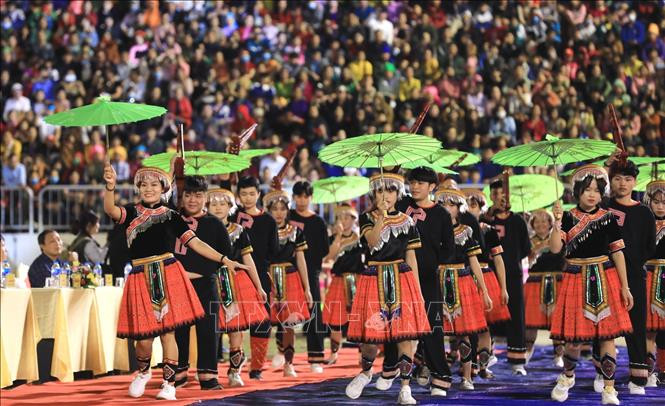 Màn diễu diễn các giá trị văn hóa đặc sắc đại diện cho các dân tộc tỉnh Yên Bái. Ảnh: Thành Đạt - TTXVN