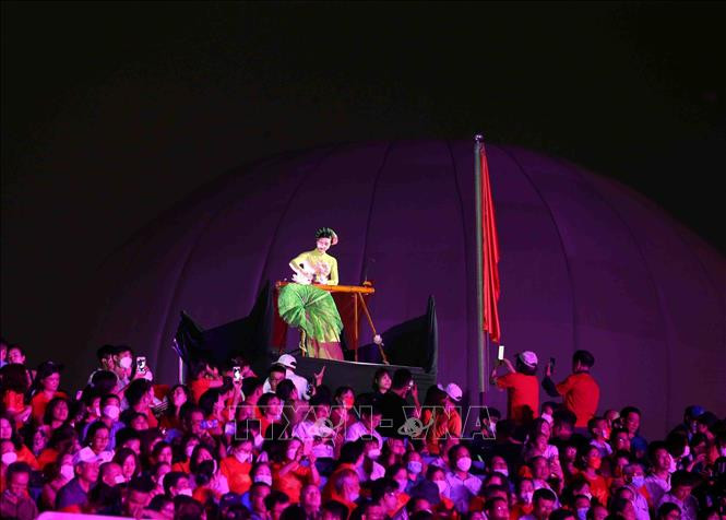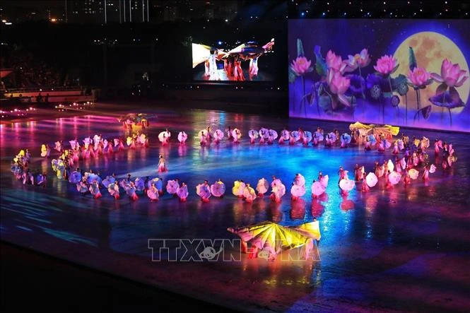 Màn múa nghệ thuật quảng trường mang tên “Hồn Sen Việt” với số lượng lớn diễn viên, nghệ sĩ kết hợp với công nghệ đồ họa để giới thiệu biểu tượng của SEA Games 31. Ảnh: TTXVN