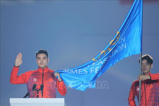 VĐV Việt Nam Vũ Thành An thay mặt các VĐV tuyên thệ. Ảnh: TTXVN