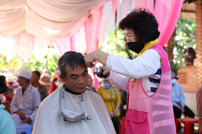 Thành viên của Hiệp hội Xúc tiến Giao lưu Jeonbuk (Hội JVEC - Hàn Quốc) cắt tóc cho người dân trên địa bàn huyện Cư M’gar, tỉnh Đắk Lắk. Ảnh: Tuấn Anh – TTXVN