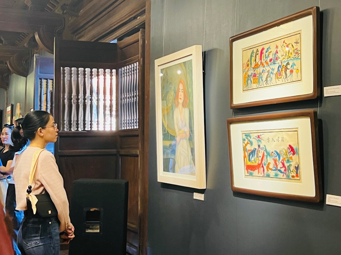 Công chúng thưởng lãm các tác phẩm tại triển lãm “Đối thoại với dòng tranh dân gian Hàng Trống”. Ảnh: Đinh Thuận - TTXVN