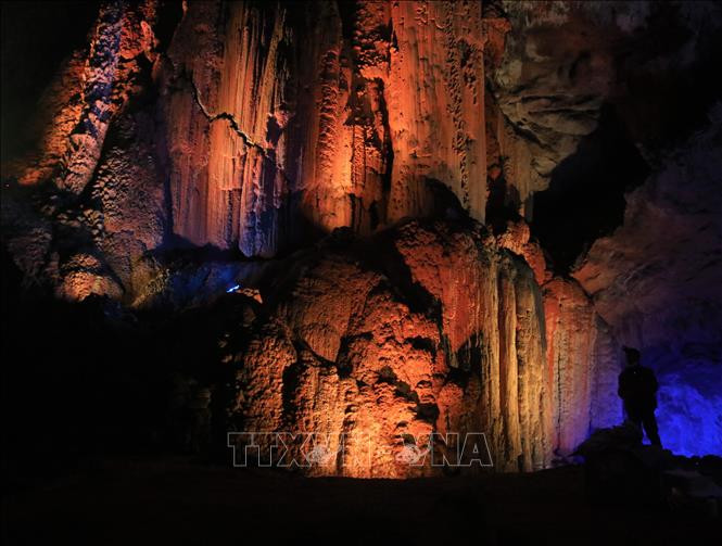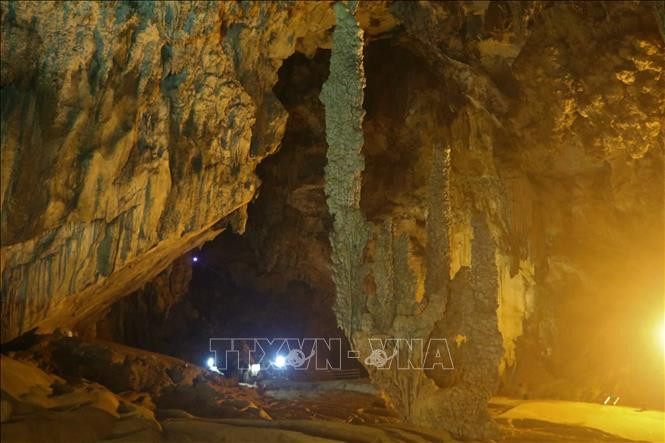 Những khối thạch nhũ kỳ vĩ trong Động Ngườm Ngao - nhánh Bản Thuôn. Ảnh: Chu Hiệu-TTXVN