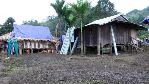 | Bộ đội và dân quân đang giúp dân dựng lại nhà. Ảnh: Nguyễn Sơn - TTXVN |