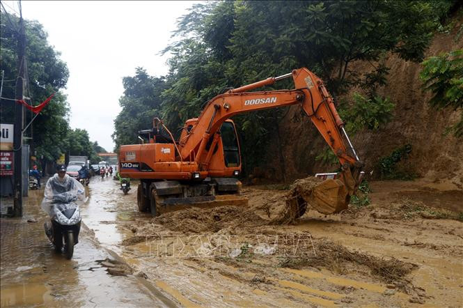 Lực lượng chức năng huyện Bát Xát đưa máy xúc đến khắc phục sạt lở đất gây ách tắc giao thông tại xã Quang Kim. Ảnh: Quốc Khánh/TTXVN