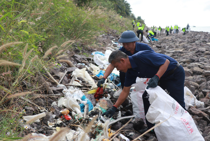 Các tình nguyện viên nhặt rác tại khu vực bờ kè biển Vĩnh Trường, sát bến tàu du lịch Nha Trang. Ảnh: Phan Sáu - TTXVN
