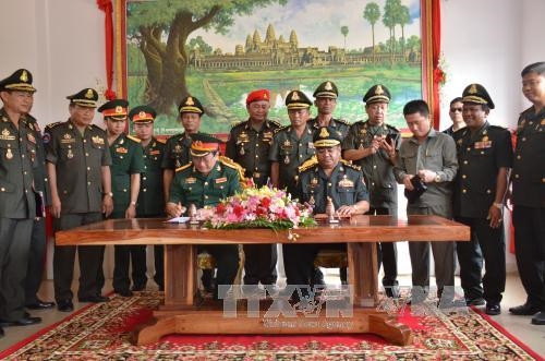 Thống tướng Hing Bunheang, Phó Tổng Tư lệnh, kiêm Tư lệnh Bộ Tư lệnh Cảnh vệ Quân đội Hoàng gia Campuchia và Đại tá Nguyễn Anh Dũng, Tùy viên Quốc phòng Việt Nam tại Campuchia, đại diện Bộ Quốc phòng Việt Nam ký kết biên bản nghiệm thu và bàn giao công trình. Ảnh: Phan Minh Hưng - Phóng viên TTXVN tại Campuchia