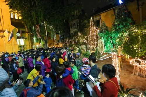 Các nhà thờ trên địa bàn Hà Nội được trang hoàng lộng lẫy và ấn tượng cho Lễ Thiên Chúa Giáng sinh để đón giáo dân cũnộg như khách thập phương đến tham quan. Đồng bào Công giáo nô nức đến các nhà thờ như Hàm Long, Thái Hà, Làng Tám... Đáng chú ý vẫn là Nhà thờ Lớn với nhiều cây thông sắc màu đẹp mắt. Mặt tiền nhà thờ là mô hình hang đá, nơi Chúa giáng sinh được chăng đèn sáng lung linh. Trong không khí rộn ràng, phấn khởi người dân đổ về đây ngày càng đông, ai cũng muốn được cùng chùng vui và đón khoảnh khắc Chúa ra đời đầy ý nghĩa.