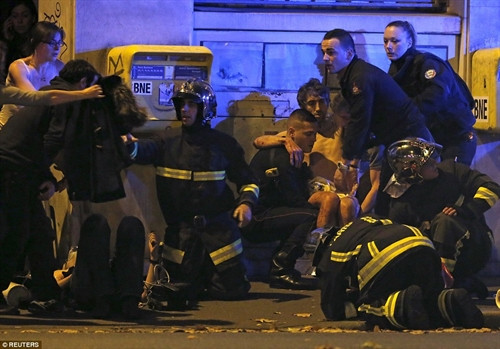 Cảnh sát giúp con tin bị thương vừa thoát ra khỏi Nhà hát Bataclan, nơi hơn 110 người vô tội đã bị khủng bố bắn chết.