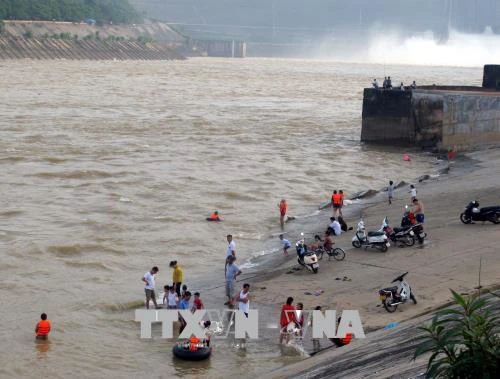 | Người dân tắm sông khi Thủy điện Hòa Bình xả Lũ. Ảnh: Thanh Hải - TTXVN |