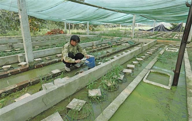 Mô hình nuôi lươn thịt, lươn giống cho hiệu quả kinh tế tốt của gia đình anh Bùi Văn Anh ở xã Lĩnh Sơn, huyện Anh Sơn. Ảnh: Trần Việt - TTXVN